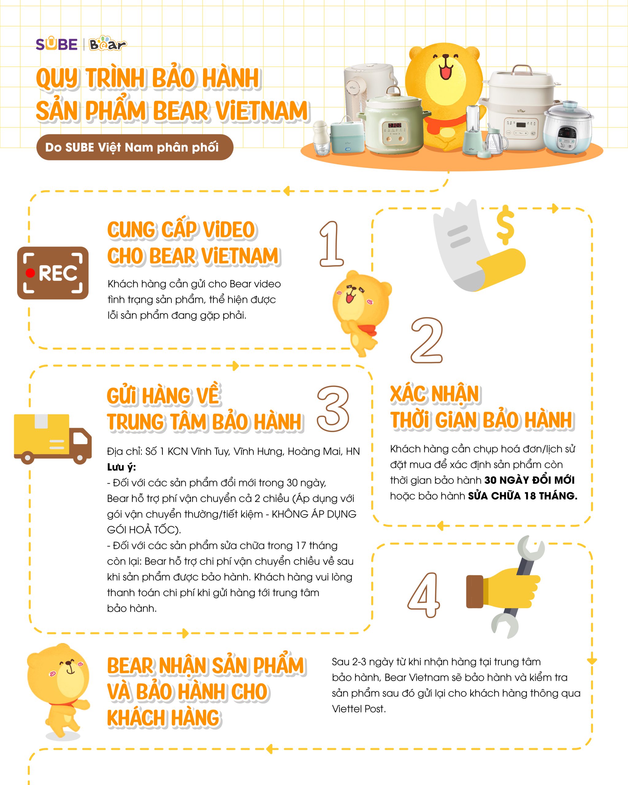 Khách hàng vui lòng gửi sản phẩm bảo hành về Trung tâm bảo hành chính hãng của Bear Việt Nam: