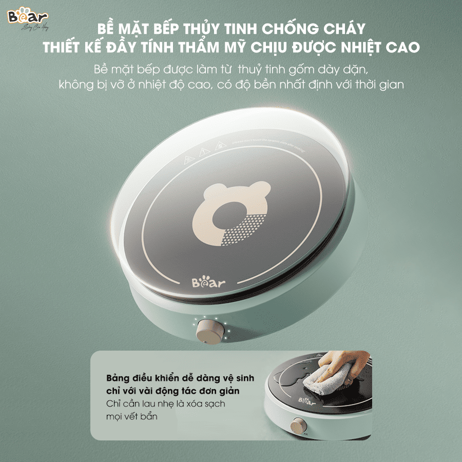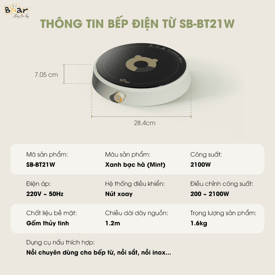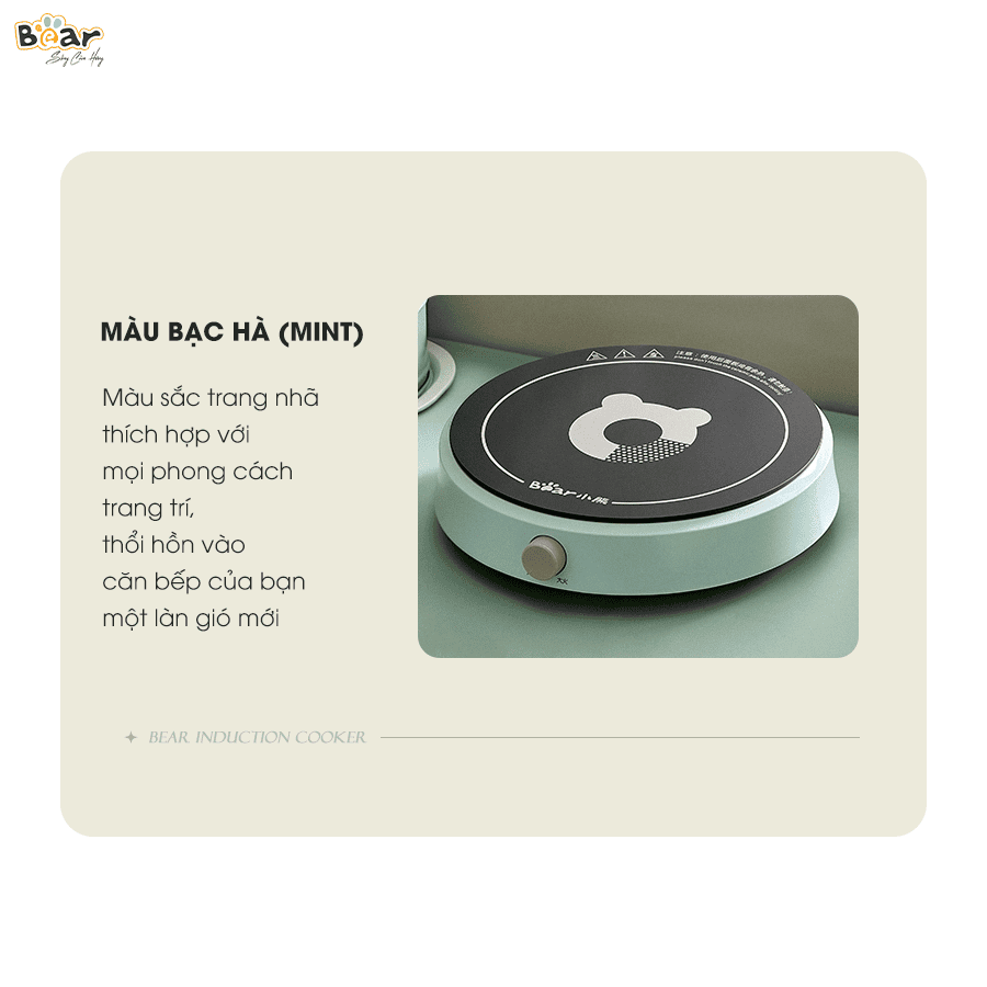 - Thiết kế hình tròn dễ thương và màu xanh bạc hà trang nhã: Mang đến nét mới mẻ, trẻ trung và đầy sức sống cho căn bếp. Bếp từ Bear SB-BT21W sẽ là điểm nhấn nổi bật, tạo cảm hứng cho những bữa ăn ngon.