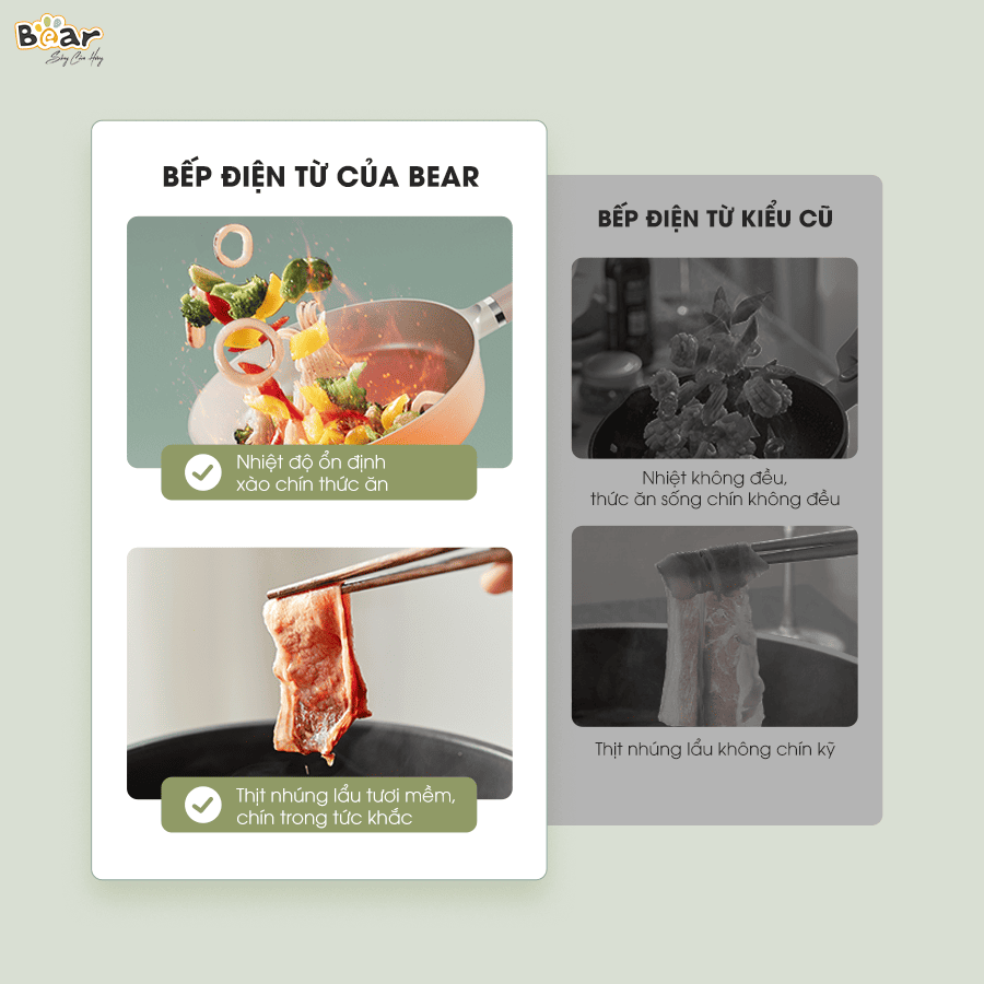Bếp từ Bear SB-BT21W hoạt động dựa trên nguyên lý cảm ứng điện từ, sinh nhiệt trực tiếp tại đáy nồi/chảo thay vì thông qua mặt bếp. Điều này giúp nhiệt lượng tập trung hoàn toàn vào việc làm chín thức ăn, không bị thất thoát ra môi trường xung quanh như bếp gas. Nhờ vậy, bếp đạt hiệu suất nấu nướng cao hơn, tiết kiệm năng lượng và thời gian cho người dùng.