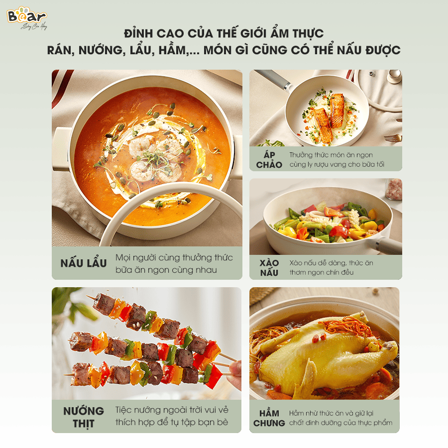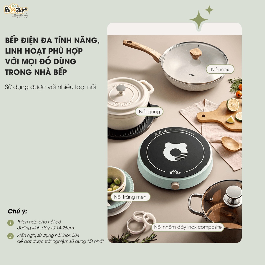 Một trong những ưu điểm tuyệt vời của bếp từ Bear SB-BT21W chính là khả năng tương thích với đa dạng các loại nồi. Bạn có thể tận dụng tối đa bộ nồi sẵn có trong nhà mà không cần phải tốn thêm chi phí đầu tư nồi chuyên dụng cho bếp từ.