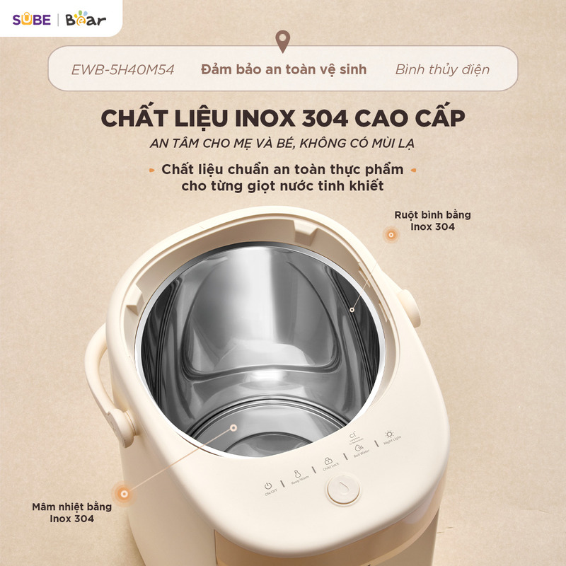 Chất liệu lòng bình là yếu tố quan trọng ảnh hưởng trực tiếp đến chất lượng nước uống. Chiếc bình thủy điện Bear EWB-5H50M54 sử dụng lòng bình inox 304 cao cấp, đảm bảo an toàn tuyệt đối cho sức khỏe của gia đình bạn.