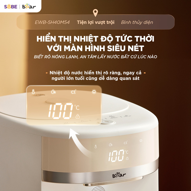 Việc kiểm soát nhiệt độ nước là vô cùng quan trọng, đặc biệt khi pha sữa cho bé hoặc pha trà để giữ trọn hương vị. Chiếc bình thủy điện Bear 5L EWB-5H50M54 được trang bị màn hình HD hiển thị nhiệt độ thời gian thực, giúp bạn dễ dàng thực hiện điều đó.