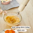Bước 5: Giữ thân bằng một tay và đặt que đánh trứng vào cốc xay; tay còn lại giữ cốc xay. Nhấn công tắc máy và máy sẽ tiếp tục hoạt động Khi khuấy lòng trắng trứng nên khuất đều tay đến khi nổi bọt mà không bị loãng; khi khuất lòng trắng và lòng đỏ trứng phải được trộn đều