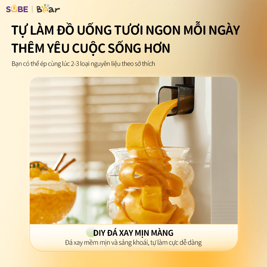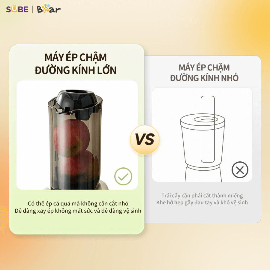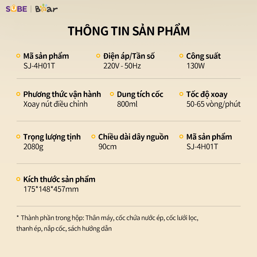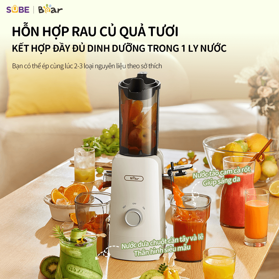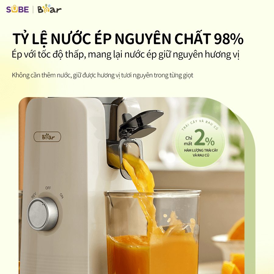 Với thiết kế trục xoắn độc quyền và công suất mạnh mẽ 130W, máy ép chậm Bear SJ-4H01T có khả năng ép kiệt bã, cho tỉ lệ ép nước 98%, giữ trọn dinh dưỡng từ rau củ quả. Cùng SUBE Việt Nam tìm hiểu chi tiết về em nó trong bài viết này nhé!