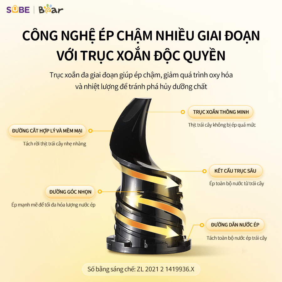 Khác với máy ép ly tâm tốc độ cao, Bear SJ-4H01T sử dụng trục xoắn để nghiền nát và ép trái cây một cách nhẹ nhàng với tốc độ chậm chỉ từ 50 – 65 vòng/phút. Quá trình ép chậm này giúp: