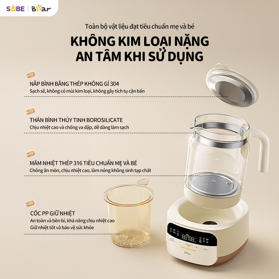 - Mâm nhiệt thép 316: Không bị gỉ sét hoặc giải phóng kim loại nặng khi đun nước, an toàn khi đun nước pha sữa cho bé.
