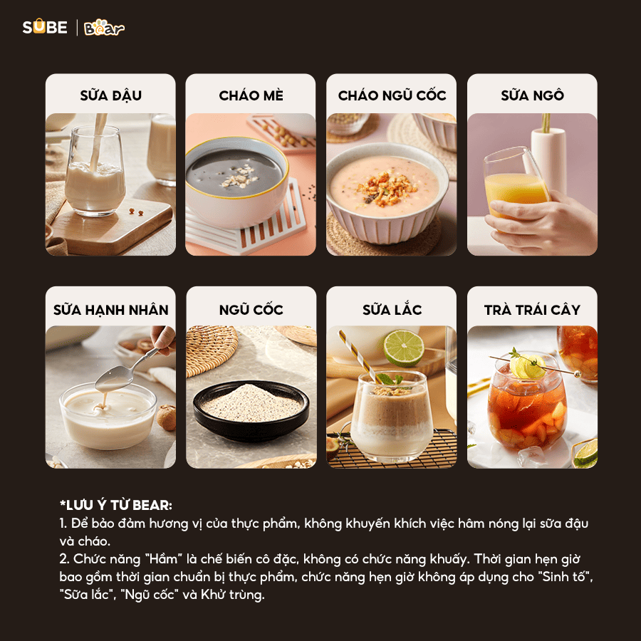 | Sữa đậu nành | Làm sữa đậu nành nguyên chất (có thể hẹn giờ trước) | Đậu nành khô: Tỷ lệ nguyên liệu và nước 1:10 – 1:15. | Sữa đậu nành |