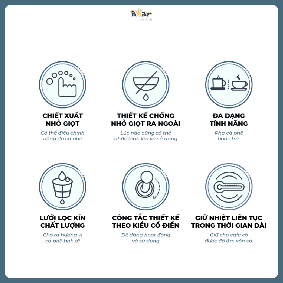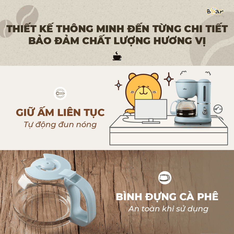 - Thỏa mãn mọi nhu cầu: Không cần phải mua riêng máy pha cà phê và ấm pha trà, máy Bear SB-CF06A cho phép bạn dễ dàng pha chế cả cà phê và trà chỉ với một thiết bị duy nhất.