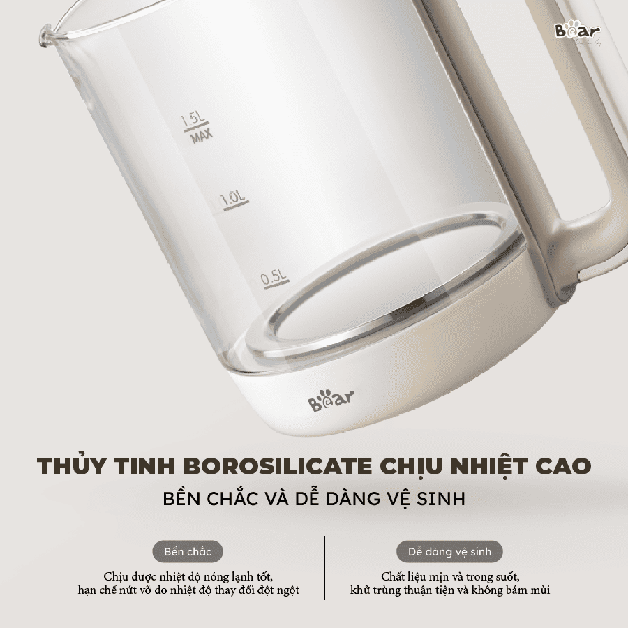 - Bình đun thủy tinh borosilicate: Khác với các loại thủy tinh thông thường, thủy tinh borosilicate có khả năng chịu lực và chịu nhiệt cực tốt, hạn chế tối đa nứt vỡ do thay đổi nhiệt độ đột ngột. Chất liệu này cũng không chứa các hóa chất độc hại, đảm bảo an toàn tuyệt đối cho sức khỏe người dùng.