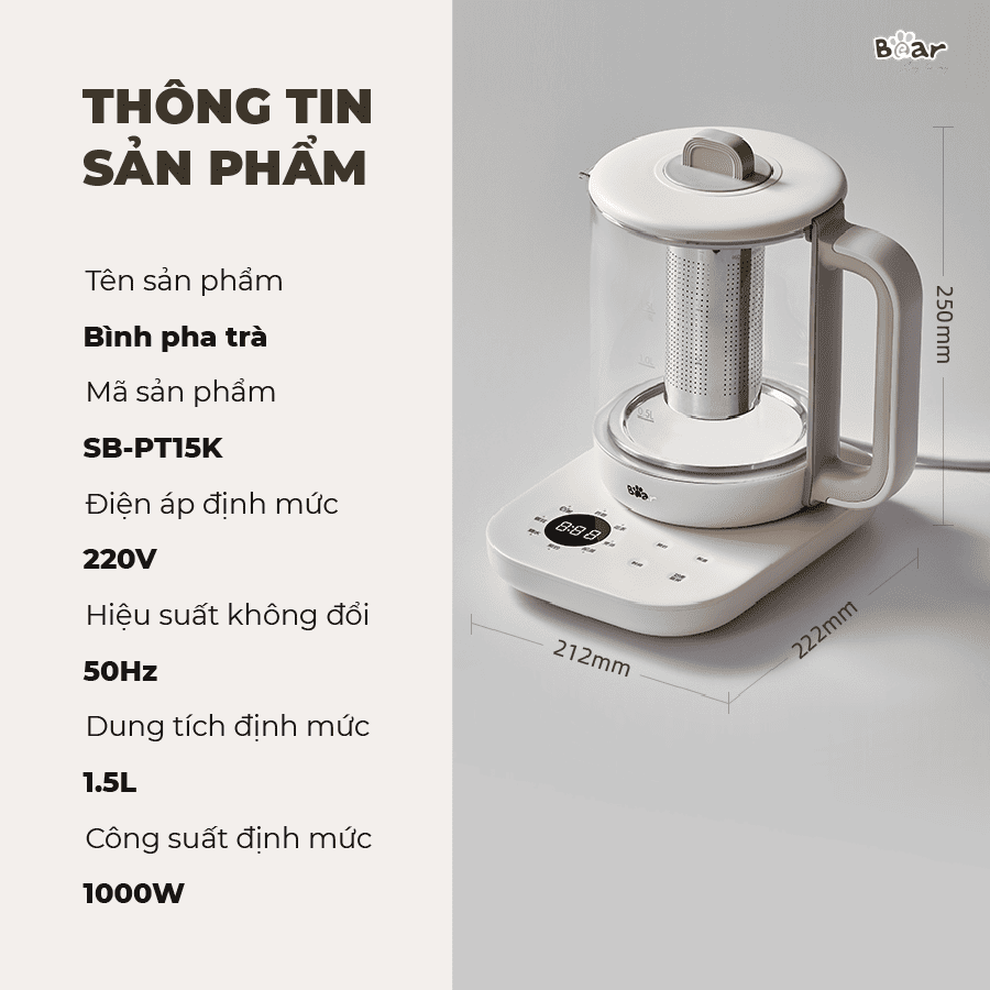 - Phù hợp với mọi không gian: Với kiểu dáng tối giản, Bear SB-PT15K dễ dàng hòa hợp với mọi phong cách nội thất, từ cổ điển đến hiện đại. Dù căn bếp nhà bạn mang phong cách nào, chiếc máy pha trà này cũng sẽ trở thành một điểm nhấn ấn tượng.
