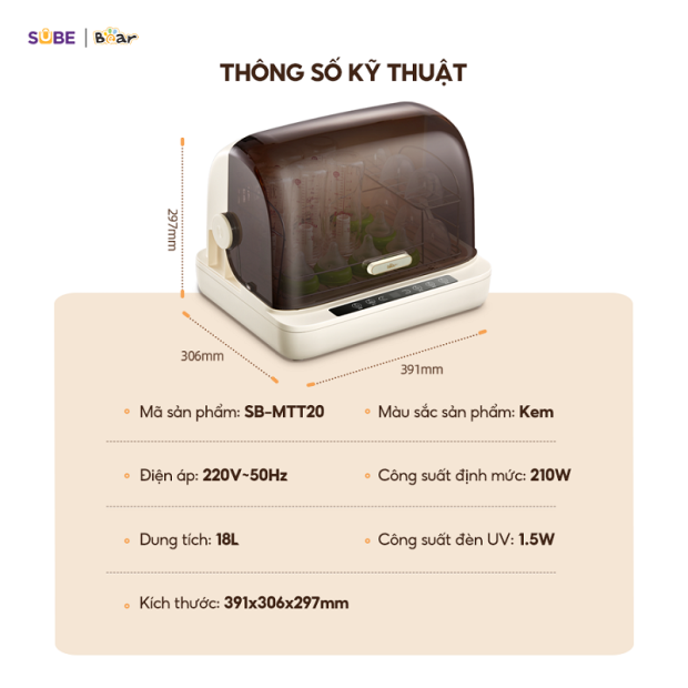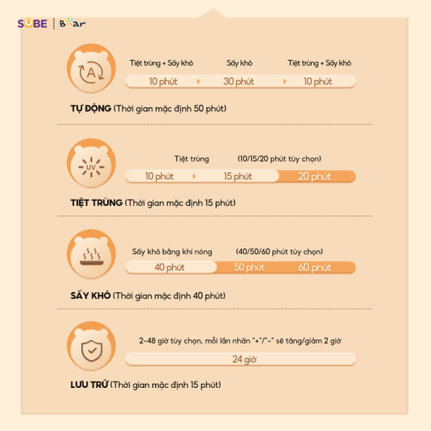 Ngoài công nghệ tiệt trùng bằng tia UV, SUBE còn cung cấp sản phẩm máy tiệt trùng bằng hơi nước – máy tiệt trùng Bear SB-MTT17. Với hơi nước nóng tuần hoàn 360 độ, máy cũng đem lại hiệu quả tiệt trùng lên đến 99.99%, an toàn cho sức khỏe của bé.