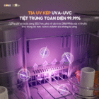 - Tia UVC kép tiêu diệt đến 99.9% vi khuẩn, virus và nấm mốc, bao gồm cả vi khuẩn kháng thuốc: UVC có khả năng tiêu diệt vi khuẩn, virus và nấm mốc bằng cách phá hủy DNA của chúng. Cơ chế tiệt trùng vô cùng hiệu quả, đảm bảo rằng, dù vi khuẩn có “trốn” ở đâu, tia UVC cũng sẽ “tìm ra” và tiêu diệt chúng.