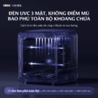 - Các đèn UV được bố trí khoa học: 8 đèn trên, 2 đèn bên trái, 2 đèn bên phải, đảm bảo tia UV chiếu đến mọi ngóc ngách của vật dụng. Thiết kế này giúp loại bỏ hiệu quả đến 99,99% vi khuẩn, virus, nấm mốc trên bề mặt vật dụng.