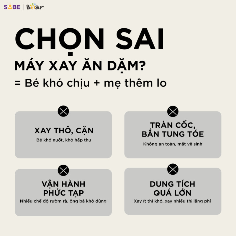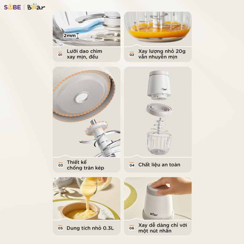 Một trong những nỗi lo lớn nhất của các mẹ là bé bị hóc hoặc khó tiêu do thức ăn còn lợn cợn, không nhuyễn mịn. Máy xay ăn dặm Bear 0.3L CH-5H02D24 sẽ giúp mẹ giải quyết vấn đề này: