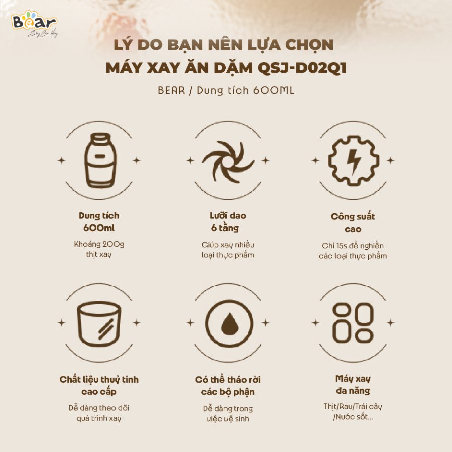 Máy xay Bear 0.6L QSJ-D02Q1 không chỉ là trợ thủ đắc lực của mẹ trong giai đoạn ăn dặm của bé, mà còn có thể sử dụng như một chiếc máy xay đa năng cho cả gia đình.