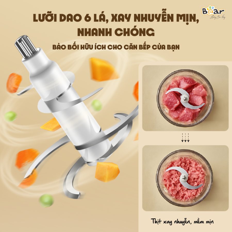 Máy xay ăn dặm Bear 0.6L QSJ-D02Q1 được thiết kế với lưỡi dao 6 lá, xay nhanh chóng và cực nhuyễn