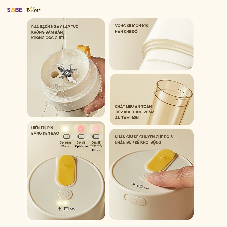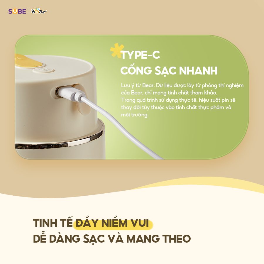 - Pin lithium 1200 mAh: Với dung lượng pin lớn, máy có thể xay liên tục từ 5 đến 10 lần sau mỗi lần sạc đầy, đảm bảo bạn thoải mái sử dụng trong suốt cả ngày. Thời gian sạc đầy cũng nhanh chóng, tiện lợi cho những ai bận rộn.