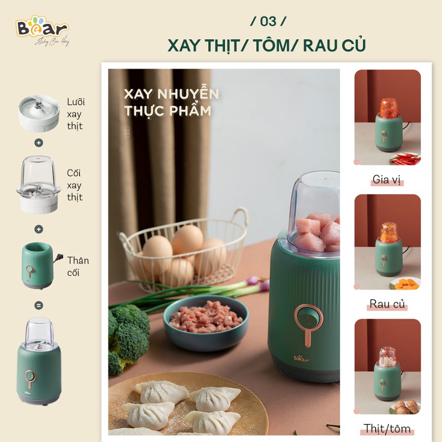 | Xay thịt | Xay nhuyễn các loại thịt, giúp bạn chuẩn bị các món ăn như chả, viên thịt. |