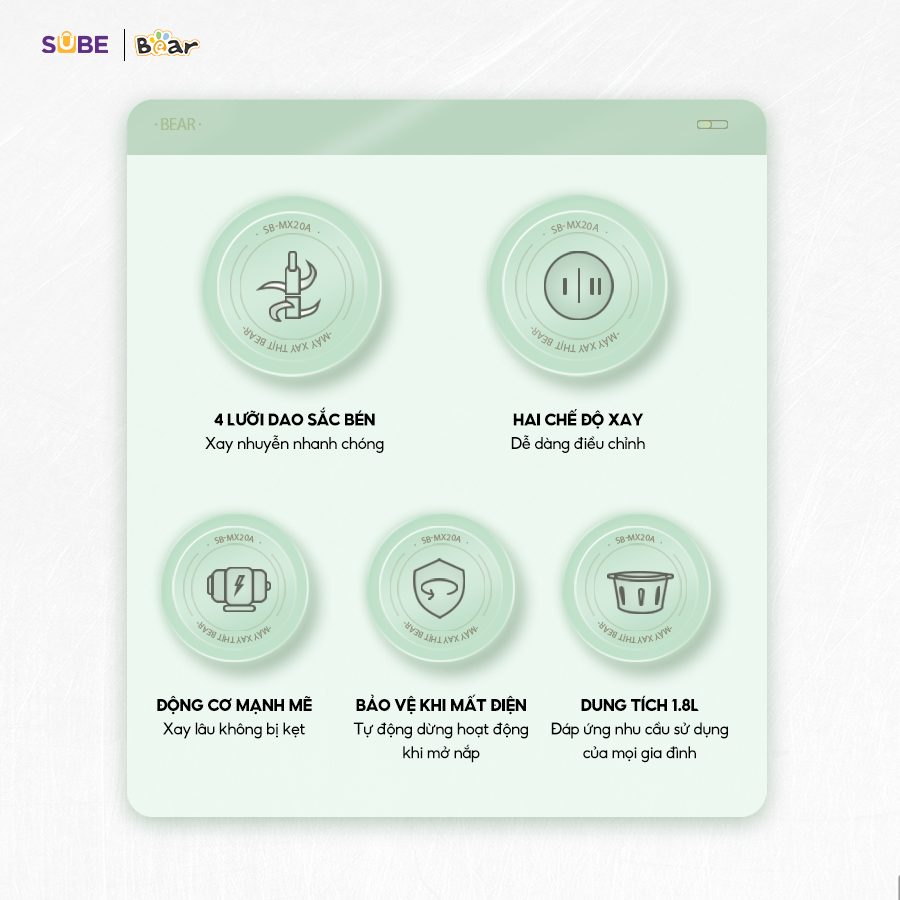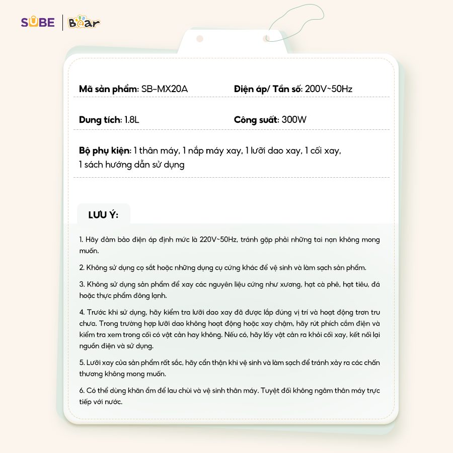 Máy xay thịt Bear 1.8L SB-MX20A không chỉ nổi bật với thiết kế hiện đại, công suất mạnh mẽ mà còn mang đến sự tiện lợi tối đa cho người dùng. Để đảm bảo chất lượng và nhận được những quyền lợi hấp dẫn, hãy mua máy xay thịt chính hãng tại công ty SUBE. Tại đây, bạn được cam kết 100% hàng chính hãng, bảo hành lên đến 18 tháng và chính sách 1 đổi 1 trong 30 ngày nếu có lỗi kỹ thuật.