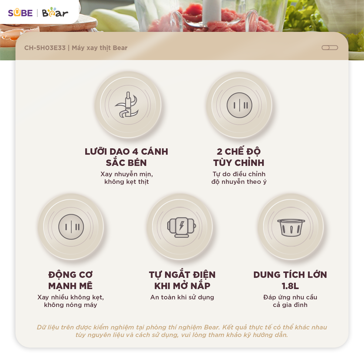 Máy xay thịt Bear 1.8L CH-5H03E33 được có các tính năng và thiết kế tối ưu nhằm mang đến trải nghiệm nấu nướng tiện lợi, hiệu quả và an toàn tối đa cho người dùng: