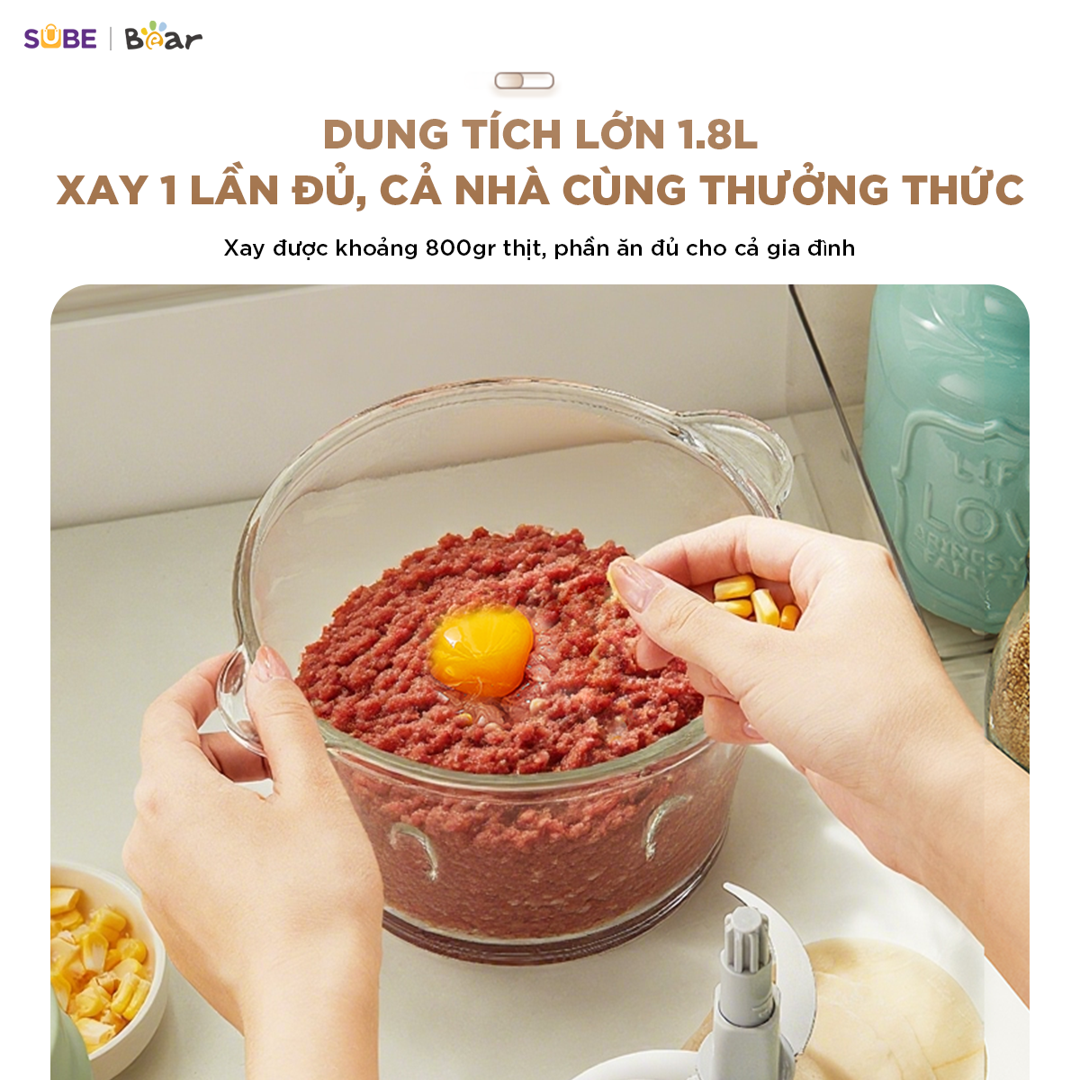 Máy xay thịt Bear giúp bạn xay nhuyễn mịn mọi loại thực phẩm chỉ trong vài giây. Thay vì tốn hàng chục phút để băm, thái thủ công, giờ đây bạn có thể hoàn thành công đoạn sơ chế một cách nhanh chóng, hoàn toàn phù hợp với nhịp sống bận rộn của gia đình hiện đại.
