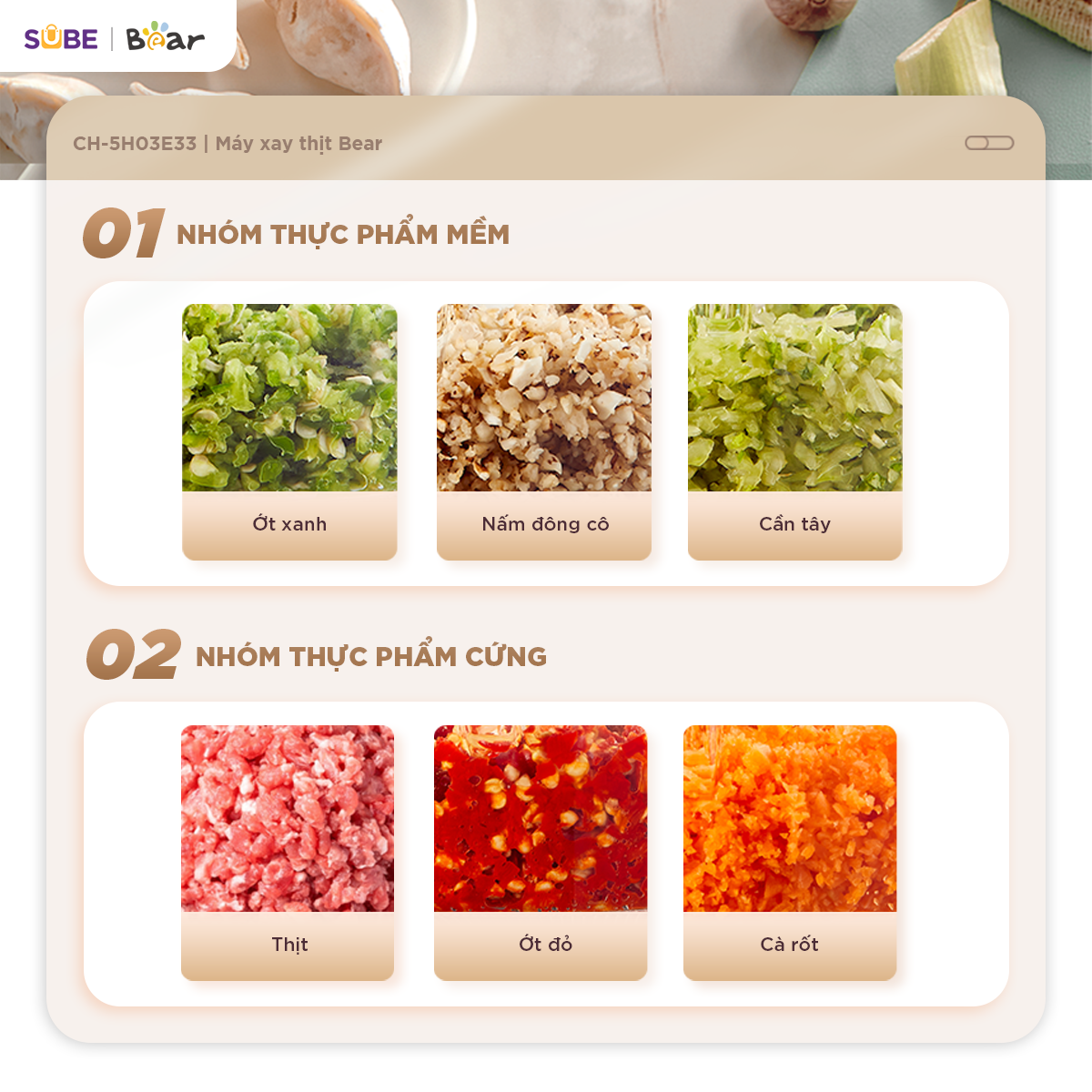 Ngoài xay thịt hiệu quả, máy xay thịt Bear 1.8L CH-5H03E33 là một thiết bị đa năng có thể xử lý nhiều loại nguyên liệu khác nhau: