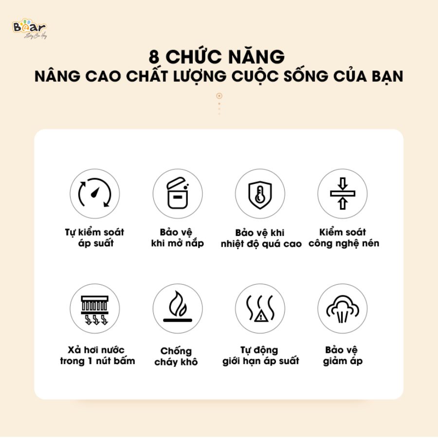 Nồi áp suất Bear 2.5L SB-AS25L không chỉ giúp bạn nấu ăn nhanh chóng mà còn mang đến sự yên tâm tuyệt đối với hệ thống 7 tính năng bảo vệ tiên tiến.