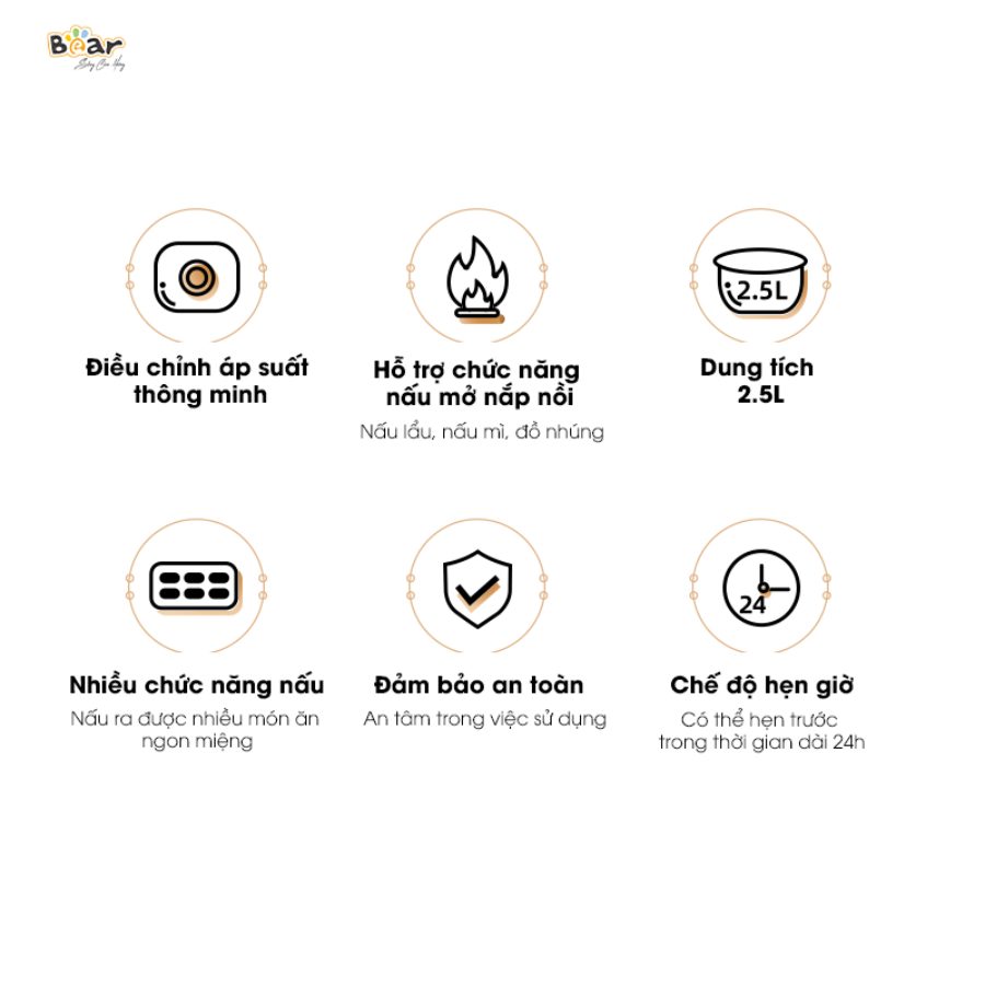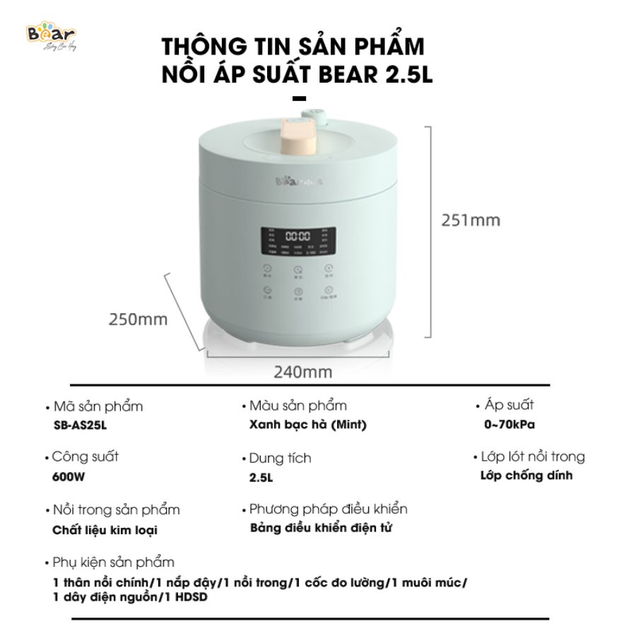 Nồi áp suất Bear 2.5L SB-AS25L là sự kết hợp hoàn hảo giữa thiết kế hiện đại, tính năng đa dạng và công nghệ tiên tiến, mang đến cho người dùng những trải nghiệm nấu nướng tuyệt vời.