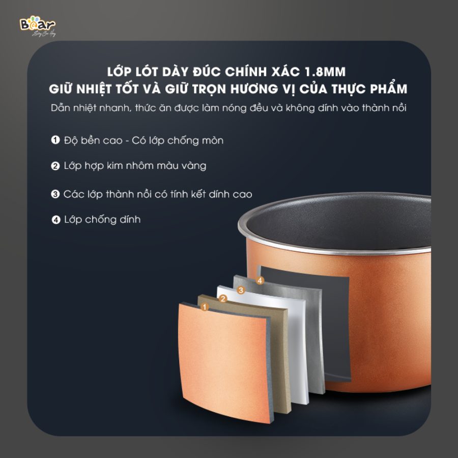 Lòng nồi của Bear 2.5L SB-AS25L dày 1.8m, được thiết kế chắc chắn, chất liệu cao cấp với 4 lớp chống dính, mang lại hiệu quả nấu nướng và vệ sinh vượt trội.