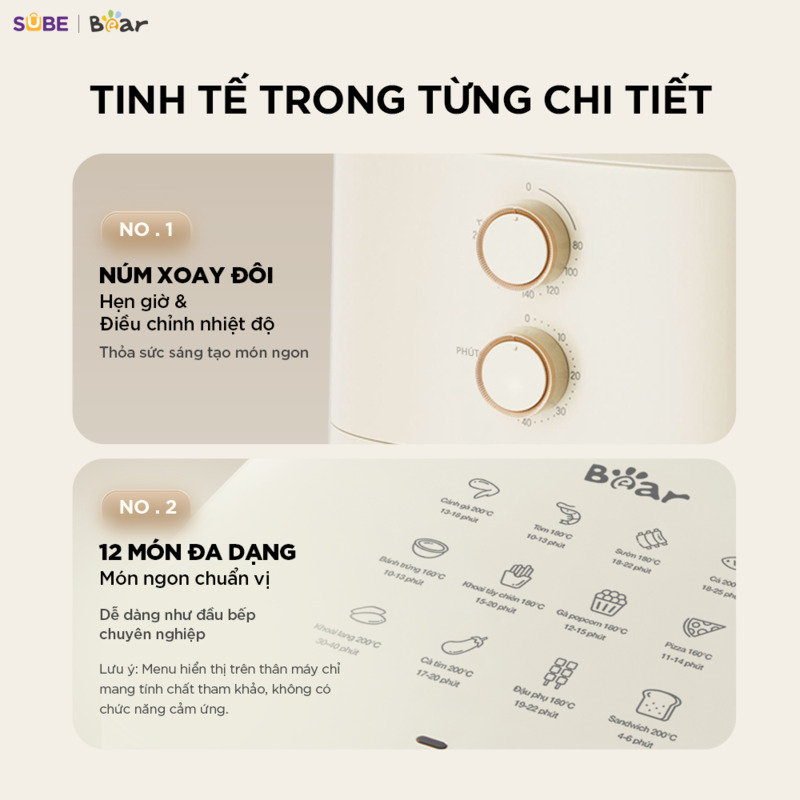 Để việc nấu nướng trở nên đơn giản hơn, Bear đã tích hợp sẵn 12 công thức gợi ý ngay trên thân máy, giúp bạn dễ dàng cài đặt nhiệt độ và thời gian chuẩn xác: