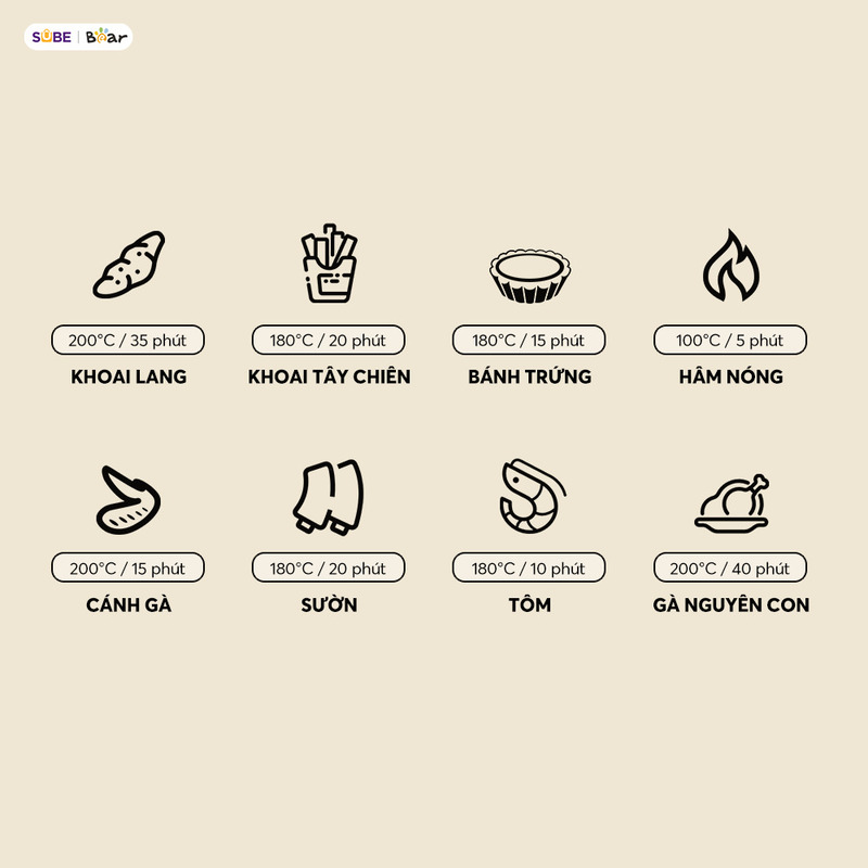 - Đa dạng lựa chọn: Bao gồm các chương trình nấu tự động cho các món ăn phổ biến như: Khoai lang, Khoai tây chiên, Bánh trứng, Hâm nóng, Cánh gà, Sườn, Tôm, Gà.