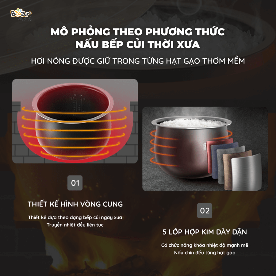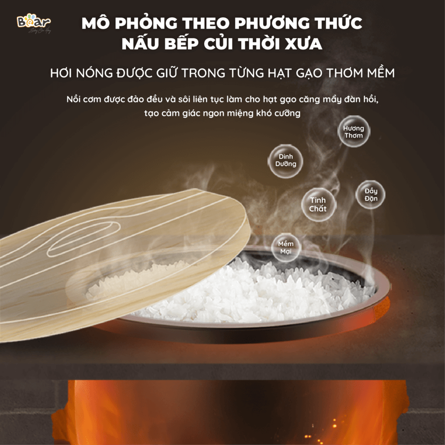 | Nấu chậm | 50 phút | Cơm được nấu từ từ ở nhiệt độ thấp, giúp các hạt gạo thấm đều nước và giữ lại hương vị tự nhiên | Phù hợp để nấu cơm dẻo, mềm mà không bị nát |