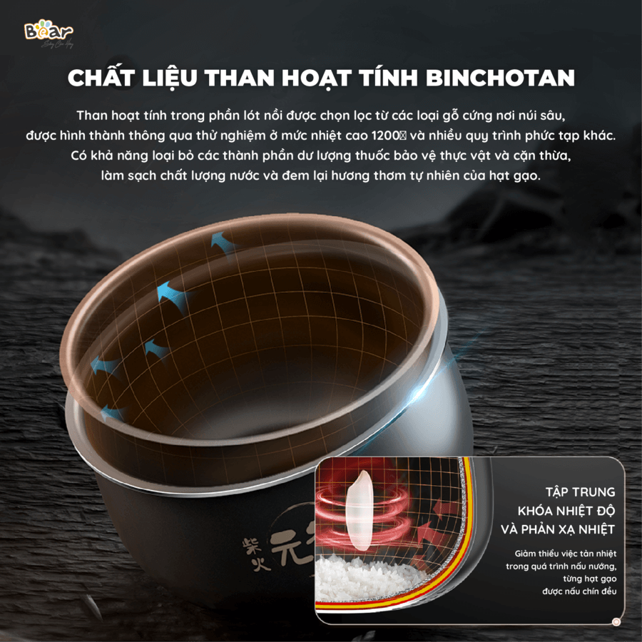 - Chất liệu than hoạt tính Binchotan: Lớp than hoạt tính Binchotan trong lòng nồi giúp loại bỏ dư lượng thuốc bảo vệ thực vật và cặn thừa, làm sạch chất lượng nước, giúp cơm có hương thơm tự nhiên, mang lại bữa ăn ngon miệng và an toàn cho sức khỏe.