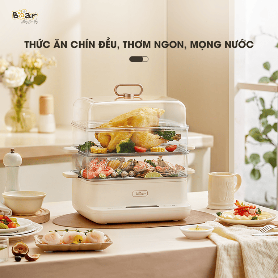 Nồi hấp Bear SB-NH12L giúp thực phẩm chín đều nhanh chóng nhờ công nghệ truyền nhiệt hiện đại và hơi nước ổn định.