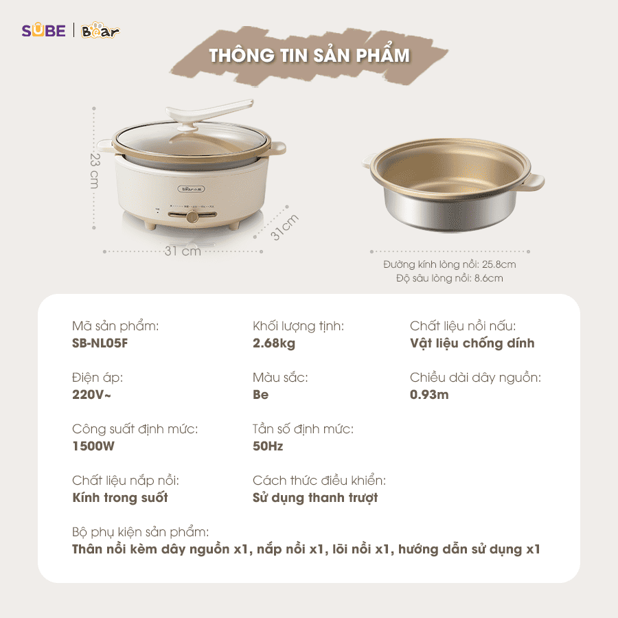 Với thiết kế hiện đại và tính năng vượt trội, nồi lẩu Bear 5L SB-NL05F không chỉ đáp ứng nhu cầu nấu nướng đa dạng mà còn góp phần làm cho mỗi bữa ăn trở nên thú vị hơn. Hãy đặt mua nồi lẩu ngay hôm nay tại SUBE để nhận ưu đãi hấp dẫn và chính sách bảo hành chính hãng 18 tháng!