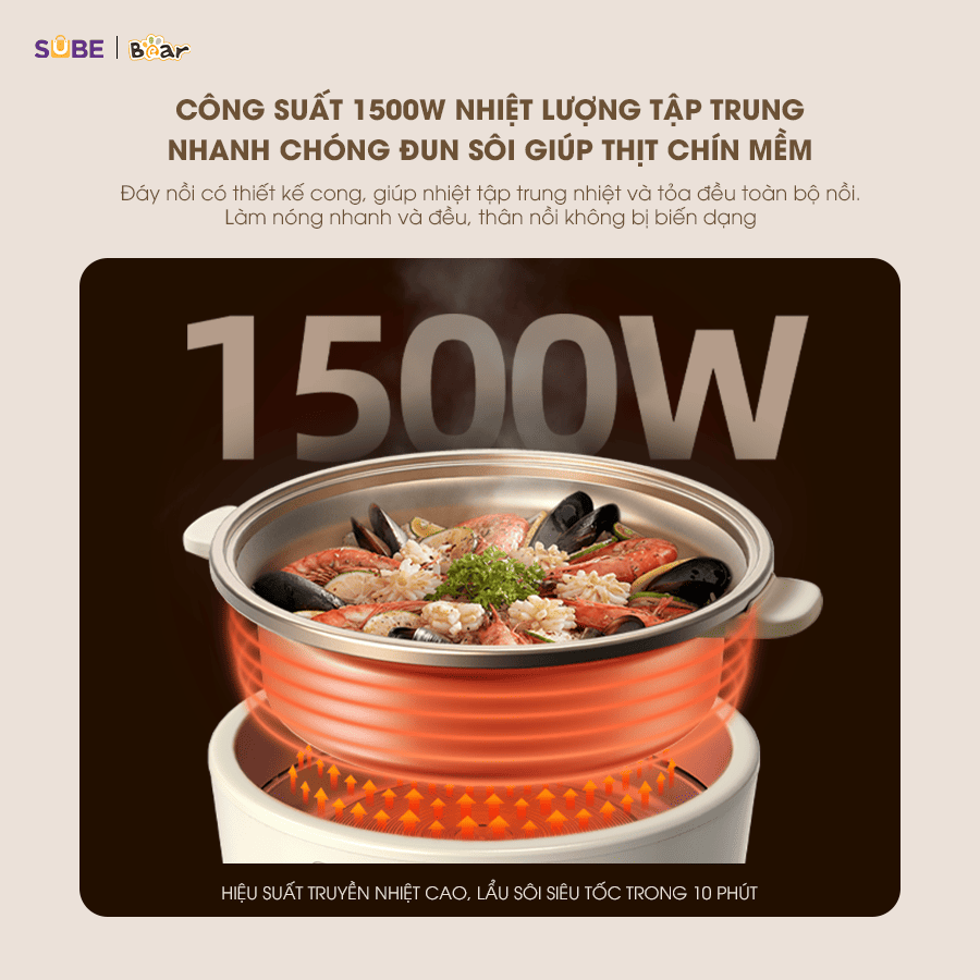 - Nhiệt đều, công suất mạnh: Với công suất 1500W, nồi làm nóng nhanh, thức ăn chín đều và giữ được độ tươi ngon.