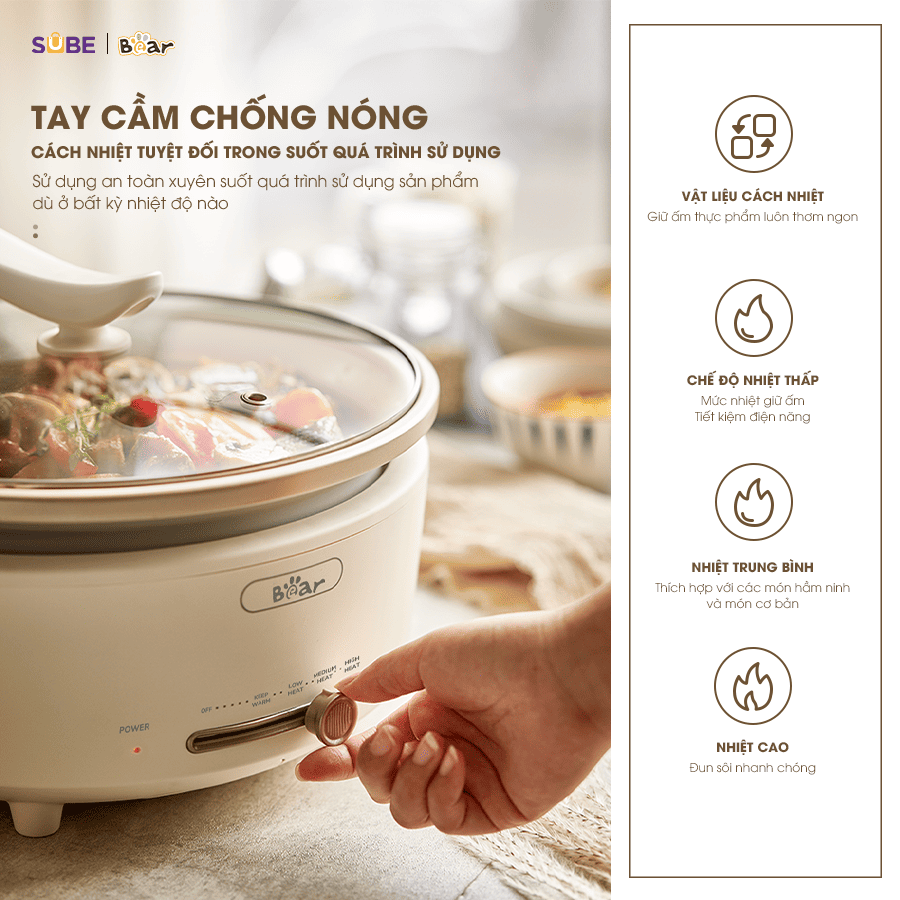 Nồi lẩu Bear 5L SB-NL05F mang đến sự tiện lợi vượt trội với 4 mức điều chỉnh nhiệt độ linh hoạt gồm Giữ ấm, Lửa nhỏ, Lửa vừa, Lửa lớn chỉ với một núm xoay. Mức nhiệt linh hoạt cũng giúp chế biến đa dạng món ăn, từ hầm xương nhừ đến đun lẩu sôi hoặc chiên giòn thực phẩm.