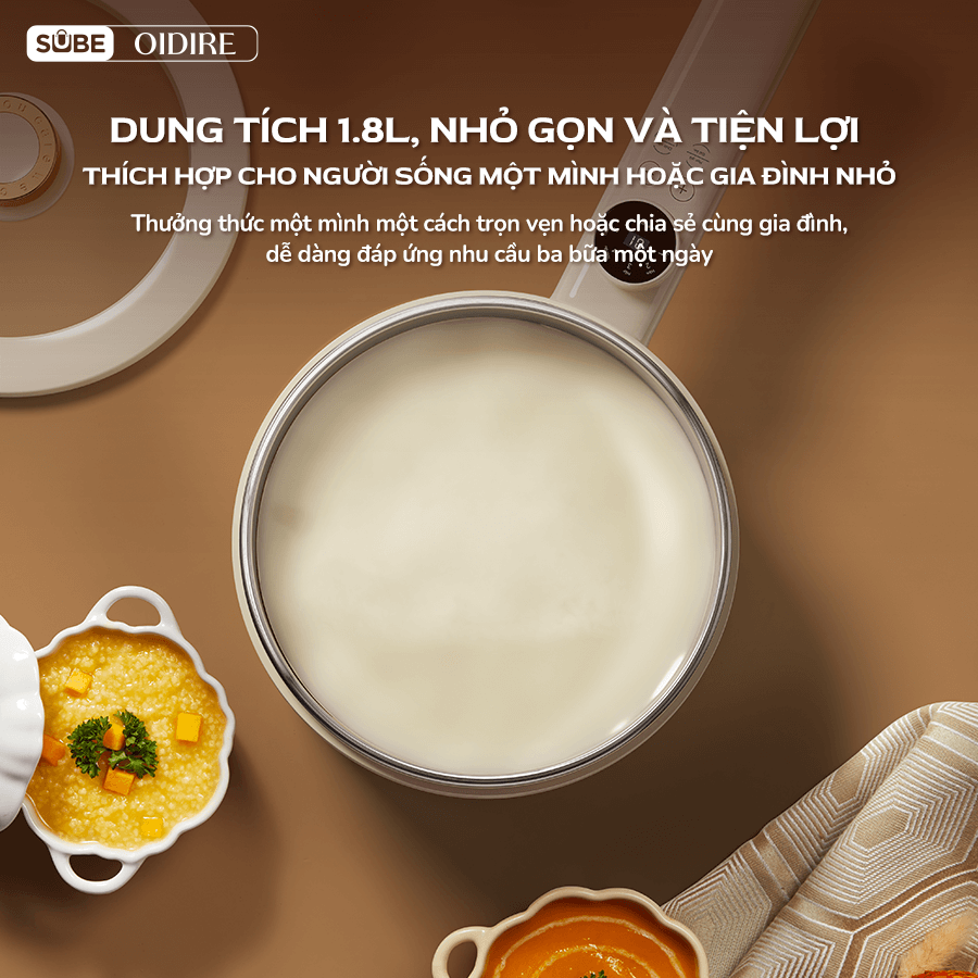 Dung tích 1.8 lít của nồi điện đa năng OIDIRE phù hợp cho mọi nhu cầu sử dụng từ cá nhân đến gia đình nhỏ, đáp ứng linh hoạt trong từng trường hợp: