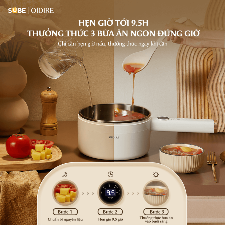Chức năng hẹn giờ của nồi điện đa năng OIDIRE 1.8L ODI06A cho phép bạn cài đặt thời gian đun nấu từ 0 – 9,5 giờ, linh hoạt phù hợp với mọi nhu cầu. Chỉ cần thiết lập thời gian, nồi sẽ tự động hoạt động và giữ nhiệt, giúp bạn tiết kiệm công sức mà vẫn đảm bảo món ăn chín đúng lúc.