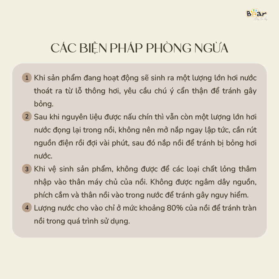 - Cẩn thận với hơi nước nóng thoát ra: Trong quá trình hoạt động, hơi nước sẽ thoát ra từ lỗ thông hơi, cần cẩn thận để tránh bị bỏng.